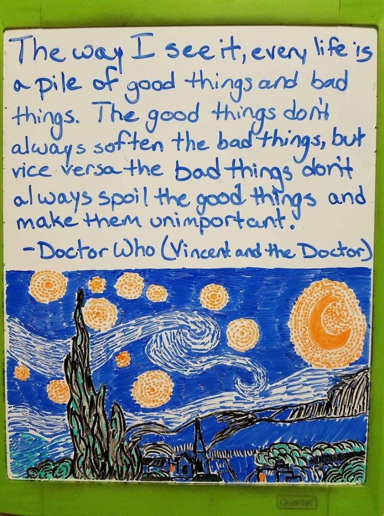 -“The way I see it, every life is a pile of good things and bad things. The good things don’t always soften the bad things, but vice versa, the bad things don’t always spoil the good things and make them unimportant.” -The Doctor (from the Doctor Who episode “Vincent and the Doctor”)